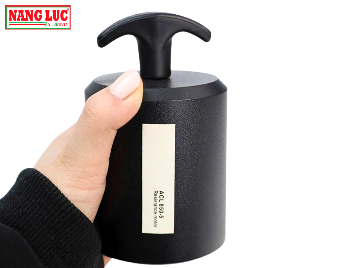 - Thiết Bị Đo Điện Trở ACL 800 được trang bị hai điện cực chuẩn 5 lb với bề mặt phủ bột chống ăn mòn, đảm bảo độ bền và tính chính xác trong từng phép đo.