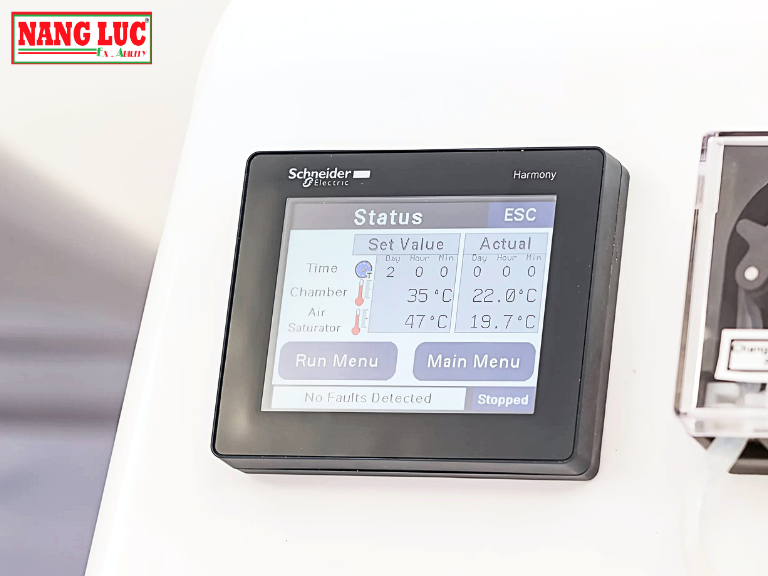 Buồng Phun Muối Ascott H1000 sử dụng bảng điều khiển cảm ứng 3,5 inch, màn hình màu đầy đủ. Giao diện được bố trí hợp lý, thân thiện với người dùng, hỗ trợ hiển thị cả dạng đồ họa và số liệu nhiệt độ. Nhờ đó, người vận hành có thể dễ dàng thiết lập, giám sát và điều chỉnh các thông số vận hành của thiết bị.