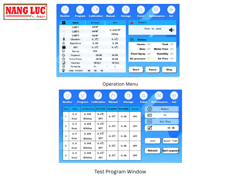 - Màn hình cảm ứng hiển thị đầy đủ các thông số thử nghiệm như cường độ bức xạ, thời gian kiểm tra, nhiệt độ bảng đen (BPT).