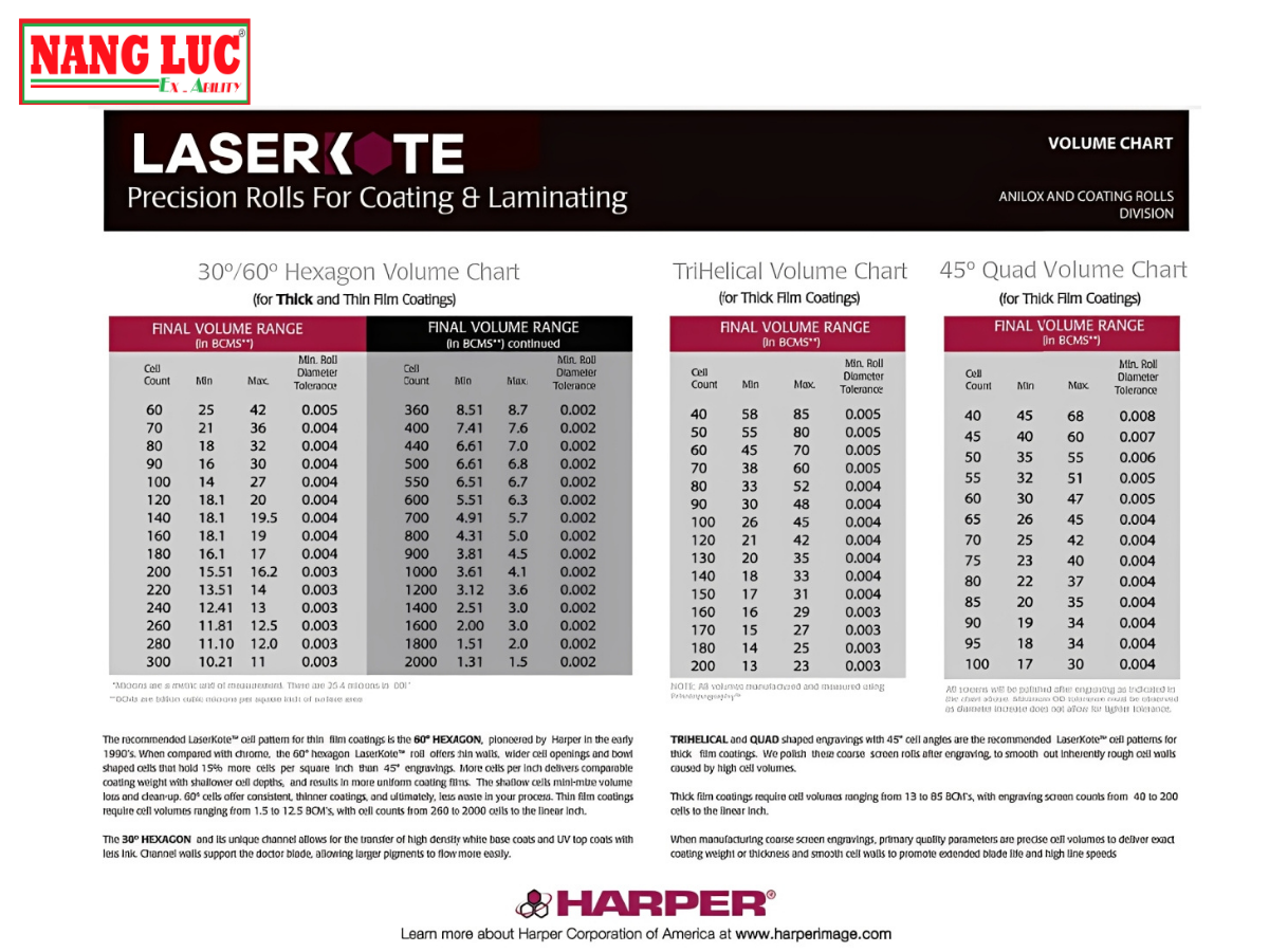 LaserKote™ precision roll cho phép kiểm soát chính xác thể tích phủ (BCM) và mật độ cell (CPI), đảm bảo lớp mực, keo hoặc coating được phân bố đồng đều trên toàn bộ bề mặt vật liệu.