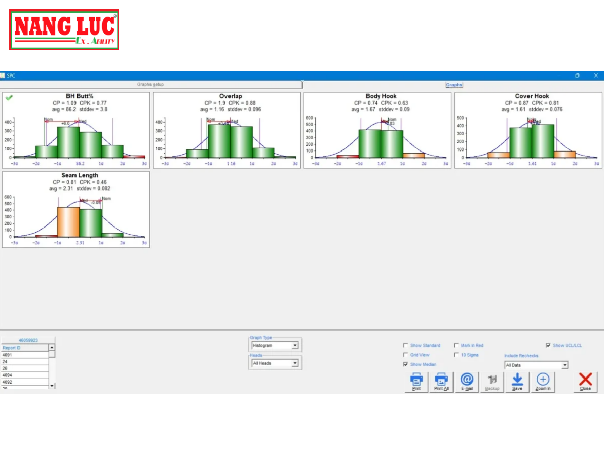 Phần mềm tích hợp công cụ thống kê SPC với các chỉ số như trung bình, độ lệch chuẩn, CP, CPK, biểu đồ Six Sigma, UCL và LCL. Người dùng có thể theo dõi xu hướng chất lượng và phát hiện sớm sai lệch quy trình sản xuất.