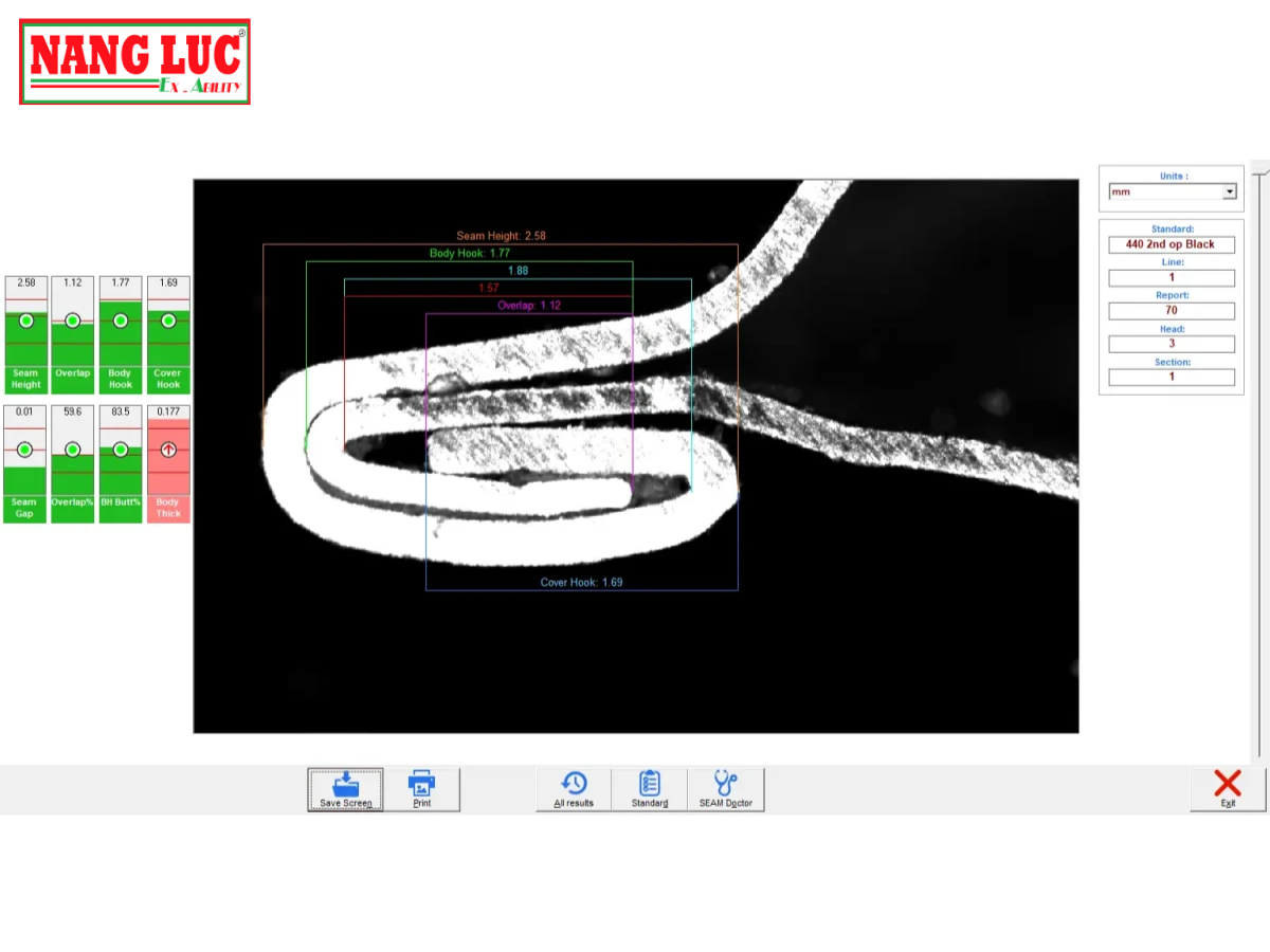SEAMetal HD được trang bị cảm biến độ phân giải cao, cho phép quan sát cấu trúc mí ghép một cách rõ ràng và chi tiết. Hình ảnh sắc nét giúp đo lường chính xác từng thông số kỹ thuật quan trọng như độ dày mí, chiều dài mí và độ chồng mí.