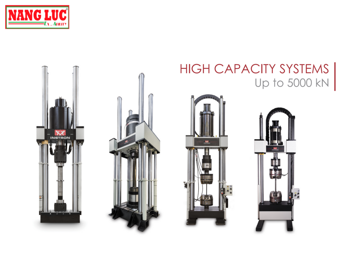 Dòng Instron High Capacity Fatigue Systems bao gồm 8803 (±500 kN), 8805 (±1000 kN), 8806 (±2500 kN) và 8808 (±5000 kN), đáp ứng nhiều mức tải từ thử nghiệm mẫu nhỏ đến kiểm tra cấu kiện cỡ lớn trong ngành năng lượng, hàng không và kết cấu thép.