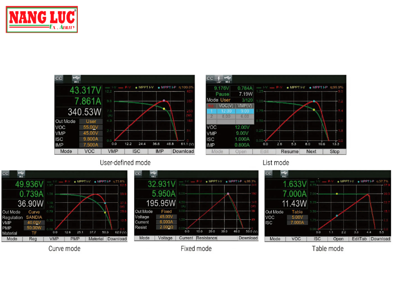 Thiết Bị Giả Lập Mặt Trời IT-N2100 Series tích hợp sẵn 5 chế độ PV chuyên dụng. Với. giao diện đồ họa thân thiện, người dùng có thể mô phỏng đường cong IV bằng nhiều phương pháp: mô hình tiêu chuẩn, nhập file mô hình qua USB, bốn điểm, bảng dữ liệu 4096 điểm, hoặc danh sách lập trình.