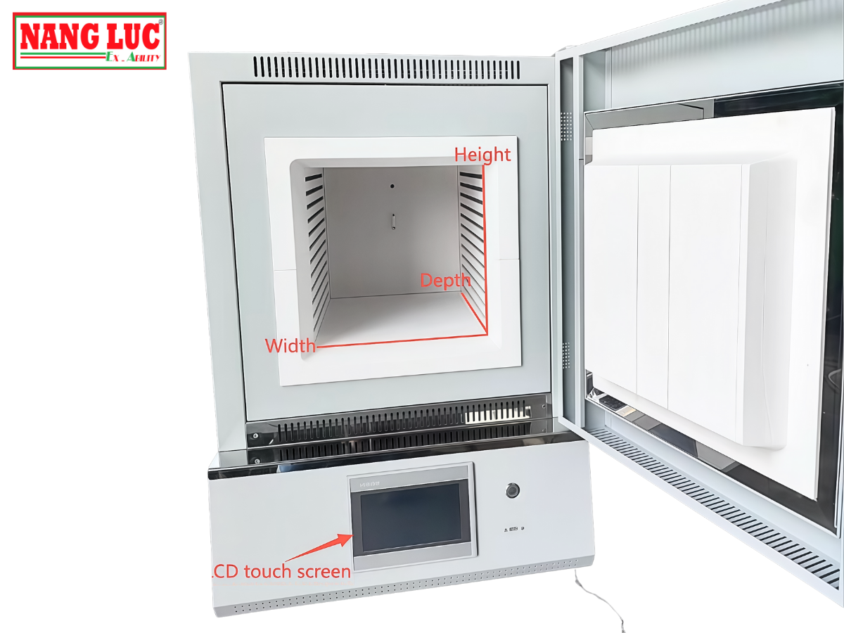 Buồng nung có kích thước Rộng 300 × Sâu 200 × Cao 120 mm, cho phép xử lý đa dạng mẫu vật từ vật liệu gốm, kim loại, bột, mẫu thí nghiệm cho đến các chi tiết nhỏ trong sản xuất kỹ thuật. Thiết kế cửa mở phía trước giúp thao tác đưa mẫu vào và lấy mẫu ra dễ dàng, an toàn và thuận tiện.