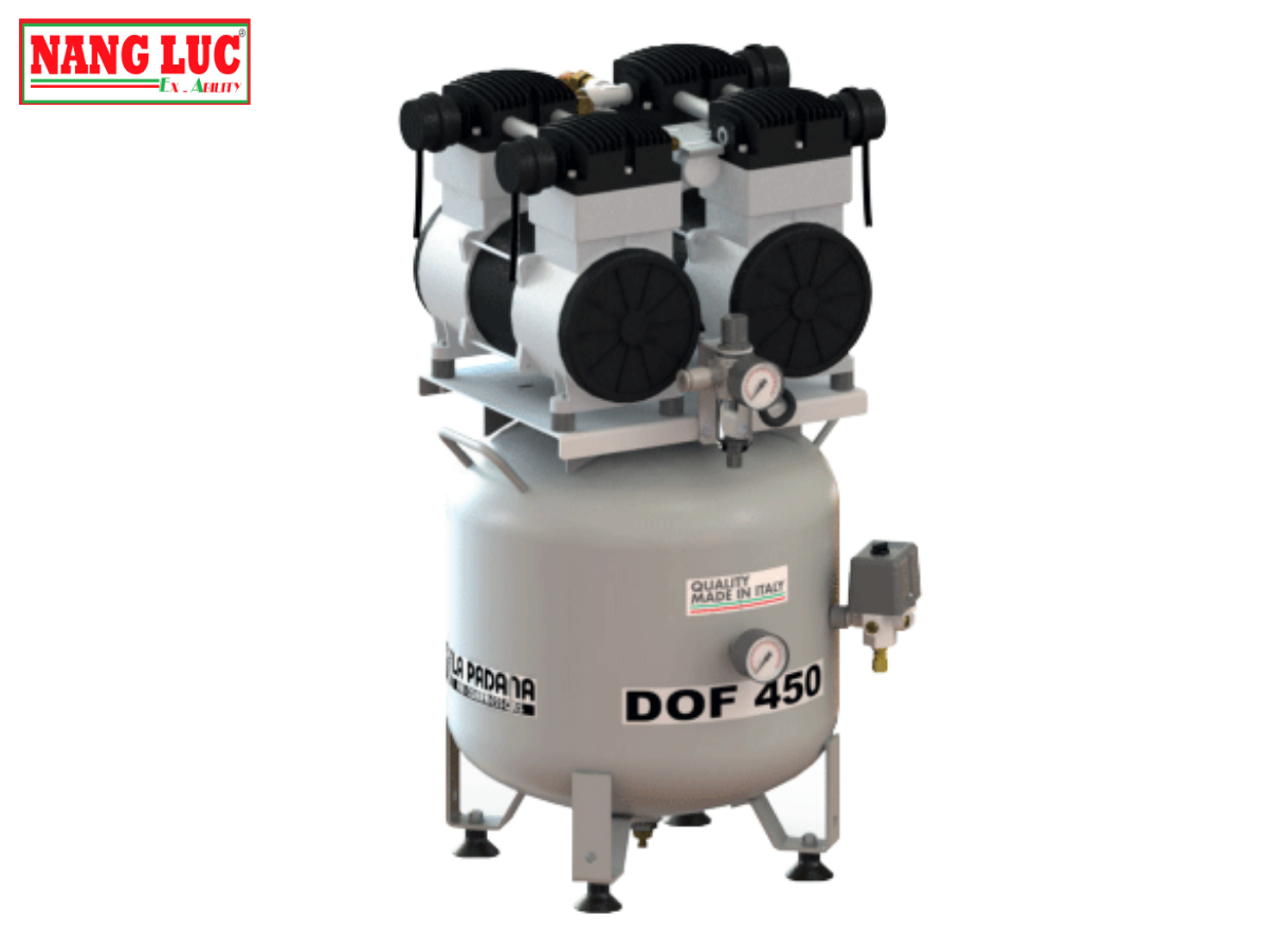 Máy Nén Khí Không Dầu LA PADANA DOF 450 là máy nén khí không dầu được thiết kế chuyên dụng cho các ứng dụng yêu cầu nguồn khí sạch và ổn định như nha khoa, phòng thí nghiệm và các hệ thống phân tích như AAS, GC.