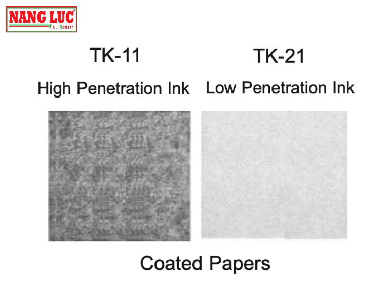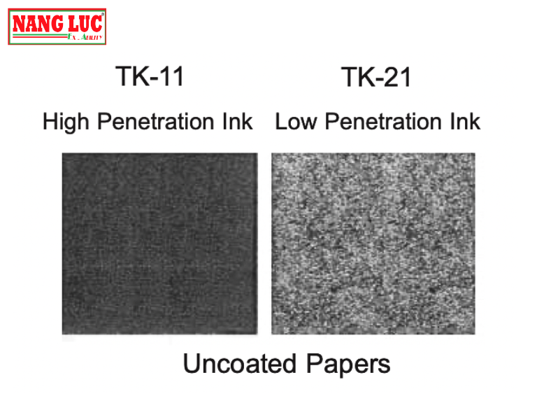 - Với loại giấy có độ xốp cao (ví dụ: giấy không tráng), mực sẽ nhanh chóng thẩm thấu vào lõi giấy. Tuy nhiên, nhờ TK-21 có độ thấm thấp nên quá trình này được kiềm chế vừa đủ để tạo ra mô hình đốm màu rõ nét mà không gây hiện tượng quá loang.