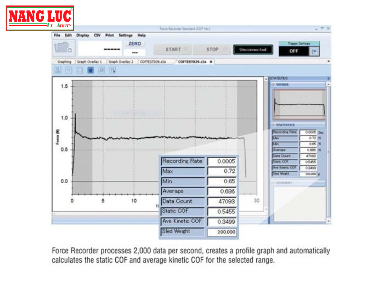 The tester includes Force Recorder Standard (COF Version) Software. This versatile USB software automatically calculates static COF and average kinetic COF with a 2,000 data per second sampling rate. The software also automatically graphs test results, for quick creation of COF profile curves. Several sleds are available, please inquire for more information.