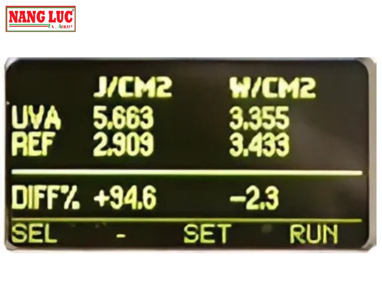 Chế độ so sánh (Reference Mode) cho phép người dùng lưu lại một kết quả đo UV làm chuẩn, từ đó so sánh với các lần đo sau để xác định sự thay đổi hiệu suất. Giá trị phần trăm chênh lệch sẽ hiển thị trực tiếp trên màn hình, giúp đánh giá nhanh tính ổn định của đèn hoặc hệ thống UV.